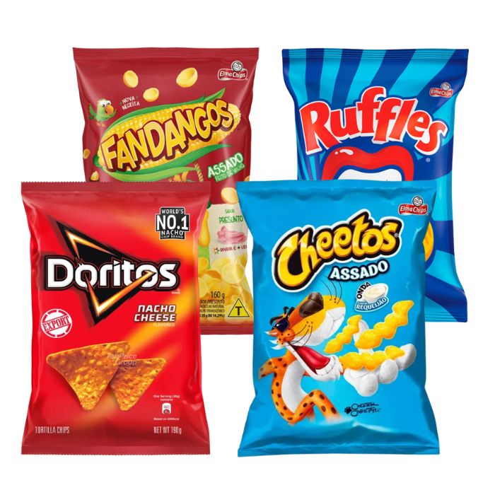 | Sabor | Baconzitos, Cebolitos, Cheetos (Mix Queijo), Cheetos (Queijo Suiço), Cheetos (Requeijão), Club Social (Snack Cebola), Club Social (Snack Pizza), Club Social (Snack Queijo), Doritos, Fandangos (Presunto), Fandangos (Queijo), Pingo D'Ouro (Bacon), Pingo D'Ouro (Picanha), Ruffles, Stiksy |